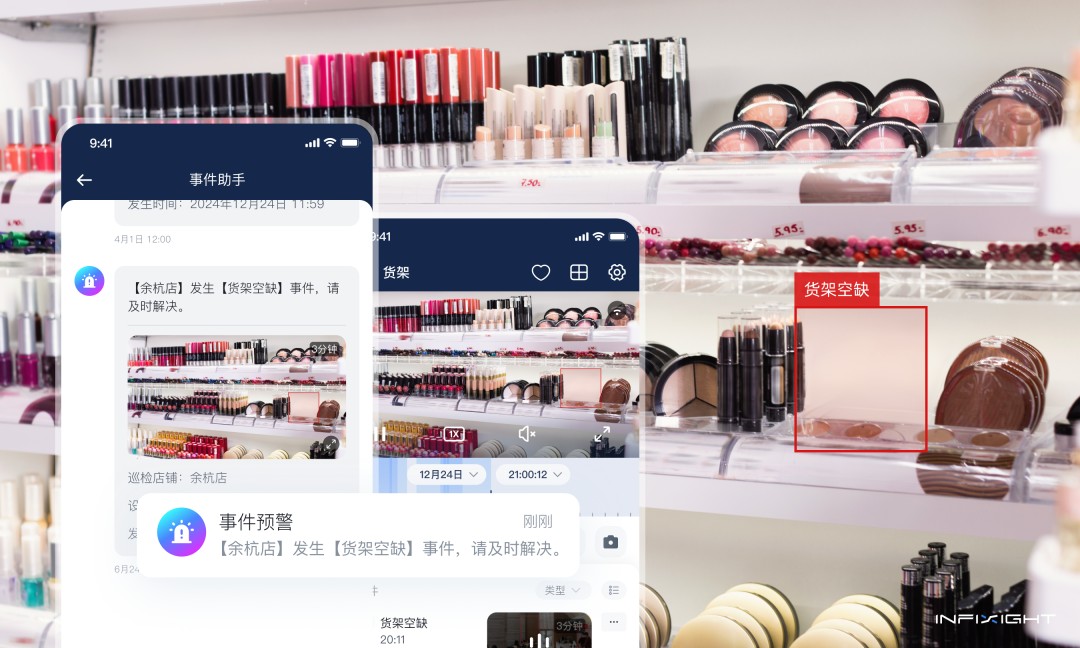智睿视界的 AI 智能巡检系统上线后,门店的货架商品陈列问题得到了彻底解决。AI 能够实时监控货架商品的满陈状态,一旦发现空缺超过规定时长,系统会立刻发送通知给店长,提醒补货。促销区域的护肤品堆头摆放是否符合计划,也能被 AI 精准识别,确保每一件商品都在「最佳位置」。