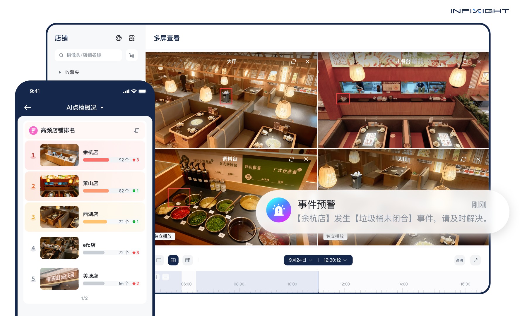 1.捍卫品质,于无声处。 粥底火锅的核心是「鲜与净」。智睿视界的 AI 巡检,死磕的就是那些影响品质与安全的细节:海鲜拼盘的摆放是否标准、客用蘸料是否按规定冷藏、厨房的垃圾桶盖子是否保持闭合状态…… 这些过去依赖人工检查容易疏漏的环节,现在被 7x24 小时的 AI 管家牢牢盯住,确保了顾客每一次体验的底层安全与稳定。