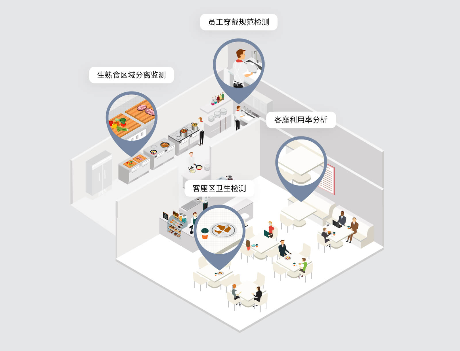食品操作复杂,需全链路监控食品安全;门店区域多,需全面清洁监测;员工多、管理链条长,需系统化提升效饧窜率、减少违规。