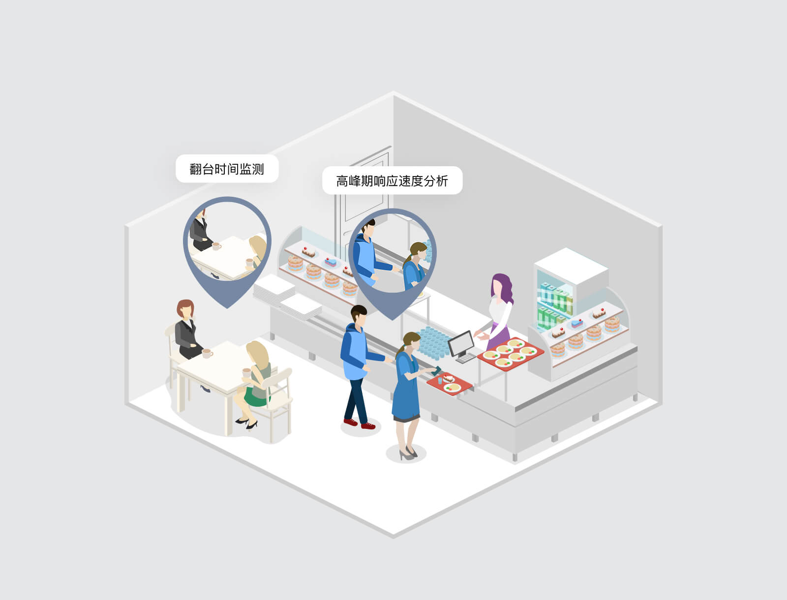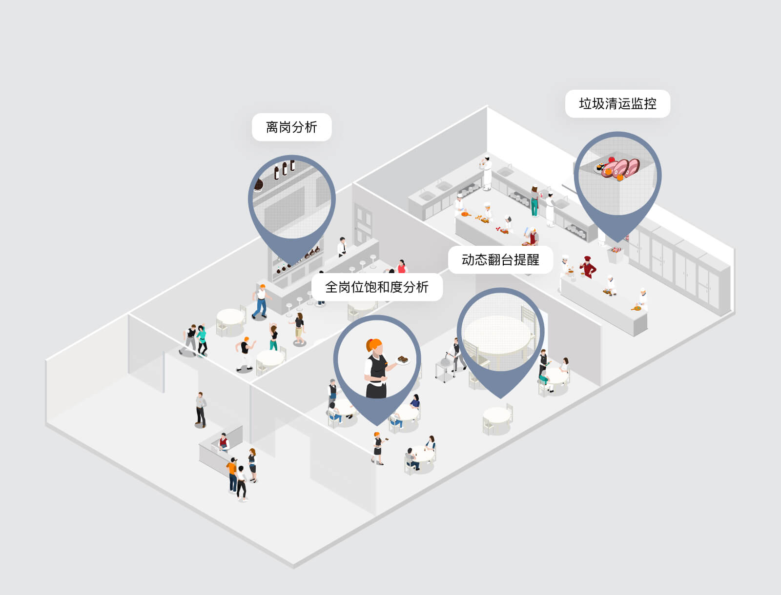 操作复杂需全链路监控食品安全;区域多需系统化监测卫生;员工多需系统化提升效率、减少违规;同时提升多区域坪效。