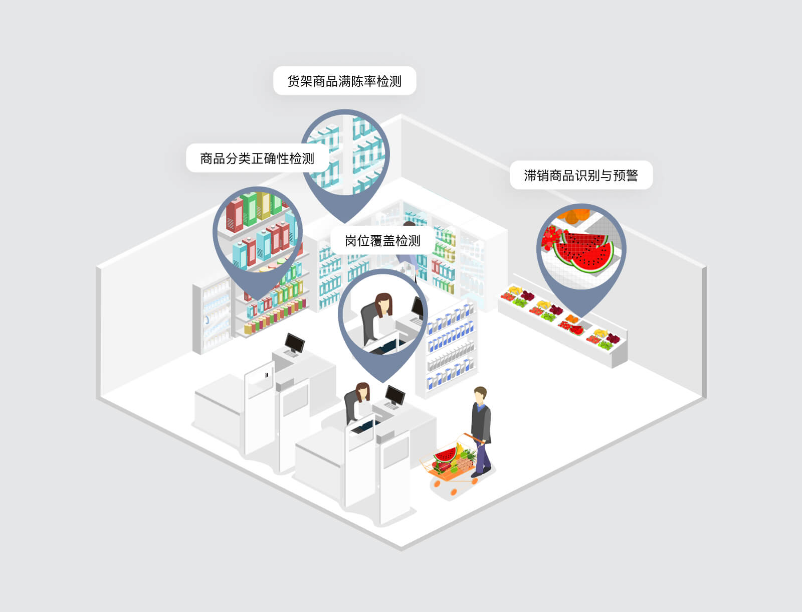 品类多陈列复杂,需整齐陈列、促销到位提升坪效;人流密集,全面监控卫生保持整洁形象;库存量大分布广,精准识别滞销隐患;员工多,关注岗位覆盖和服务效率。